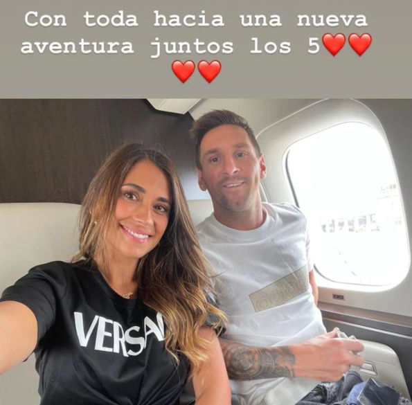 Más allá de las imágenes que logró captar la prensa en el Aeropuerto Josep Tarradellas Barcelona-El Prat del arribo de Leo con su esposa y sus hijos, fue la propia Antonela Roccuzzo la que compartió una postal de lo que están viviendo por estas horas. “Con toda hacia una nueva aventura juntos los 5″, escribió la rosarina en sus stories de Instagram tras poster una selfie junto al futbolista de 34 años ya arriba del avión.