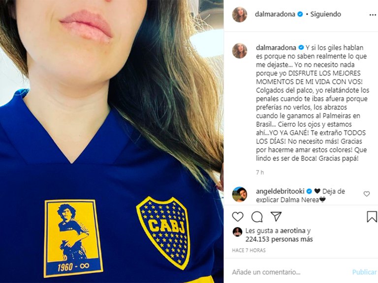“Y si los giles hablan es porque no saben realmente lo que me dejaste… Yo no necesito nada porque yo DISFRUTÉ LOS MEJORES MOMENTOS DE MI VIDA CON VOS! Colgados del palco, yo relatándote los penales cuando te ibas afuera porque preferías no verlos, los abrazos cuando le ganamos al Palmeiras en Brasil… Cierro los ojos y estamos ahí… ¡YO YA GANÉ! ¡Te extraño TODOS LOS DÍAS! ¡No necesito más! ¡Gracias por hacerme amar estos colores! ¡Qué lindo es ser de Boca! ¡Gracias papá!”, señaló en la red social.