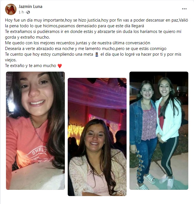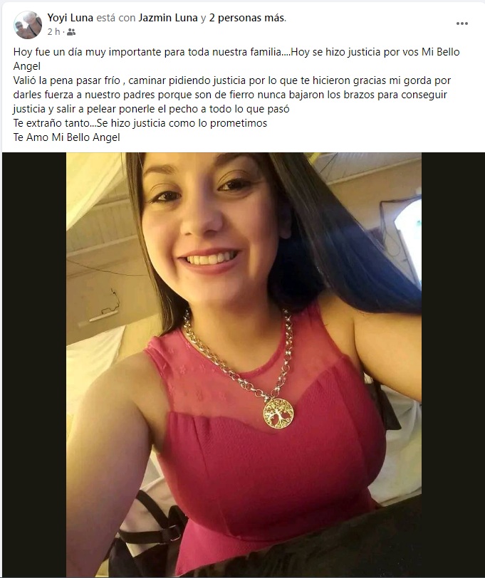 "Hoy fue un día muy importante para toda nuestra familia….Hoy se hizo justicia por vos Mi Bello Angel" (sic), escribió en Facebook Yoyi Luna, hermana de la víctima. "Valió la pena pasar frío , caminar pidiendo justicia por lo que te hicieron gracias mi gorda por darles fuerza a nuestro padres porque son de fierro nunca bajaron los brazos para conseguir justicia y salir a pelear ponerle el pecho a todo lo que pasó" (sic), agregó. Y completó: "Te extraño tanto…Se hizo justicia como lo prometimos.Te Amo Mi Bello Angel" (sic).