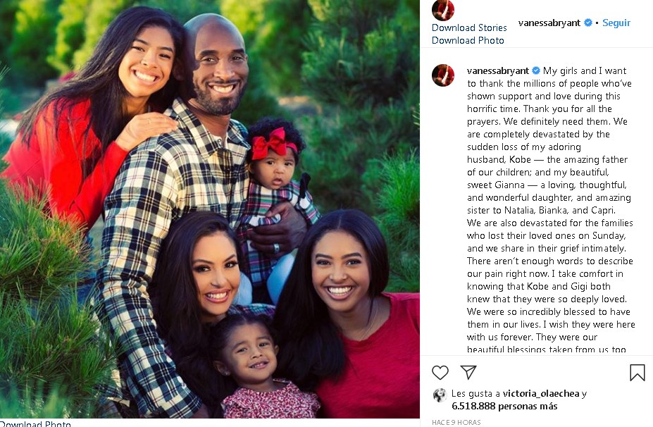 Vanessa agradeció "las oraciones y por amar a Kobe, Gigi, Natalia, Bianka, Capri y a mí".