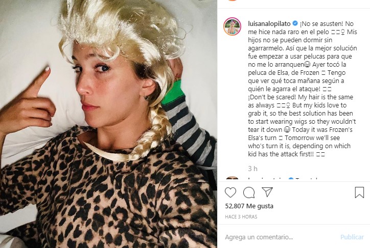 Ante esto, escribió: “No se asusten. No me hice nada raro en el pelo ♀ Mis hijos no se pueden dormir sin agarrarmelo. Así que la mejor solución fue empezar a usar pelucas para que no me lo arranquen Ayer tocó la peluca de Elsa, de Frozen Tengo que ver qué toca mañana según a quién le agarra el ataque! ”.