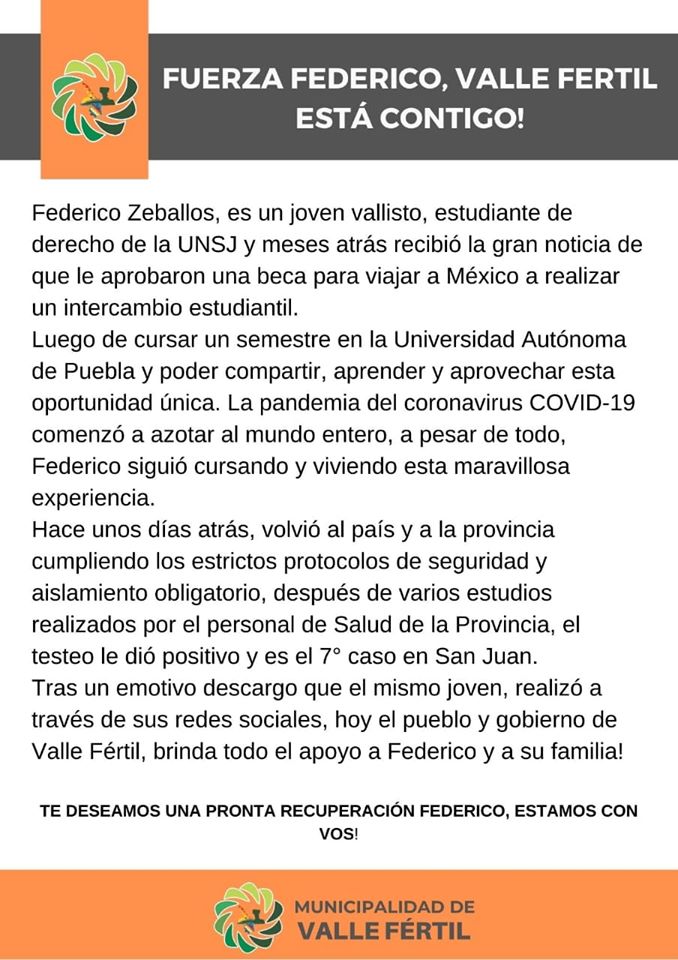 El pasado viernes, las autoridades del Ministerio de Salud de la provincia dieron a conocer la detección del séptimo caso de coronavirus en San Juan. Sin dar mayores detalles, indicaron que se trataba de un hombre joven, que había llegado desde el exterior y estaba aislado y que se trataba de un cuadro asintomático. Horas más tarde, Federico Zeballos, un joven vallista de 23 años, difundió un mensaje en las redes informó que él era la persona diagnosticada. Antes esa situación, el municipio de Valle Fértil emitió un comunicado manifestando su apoyo.