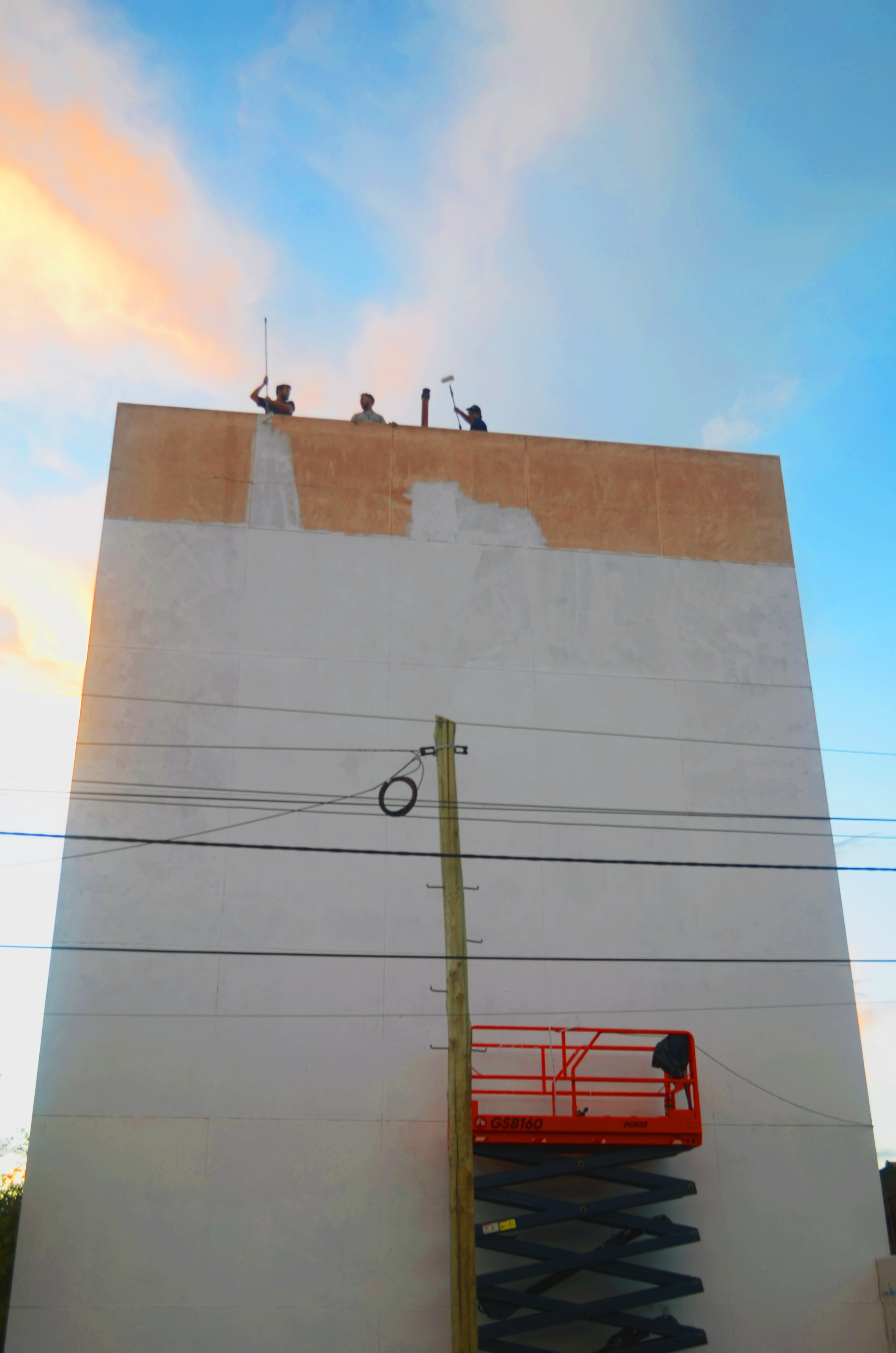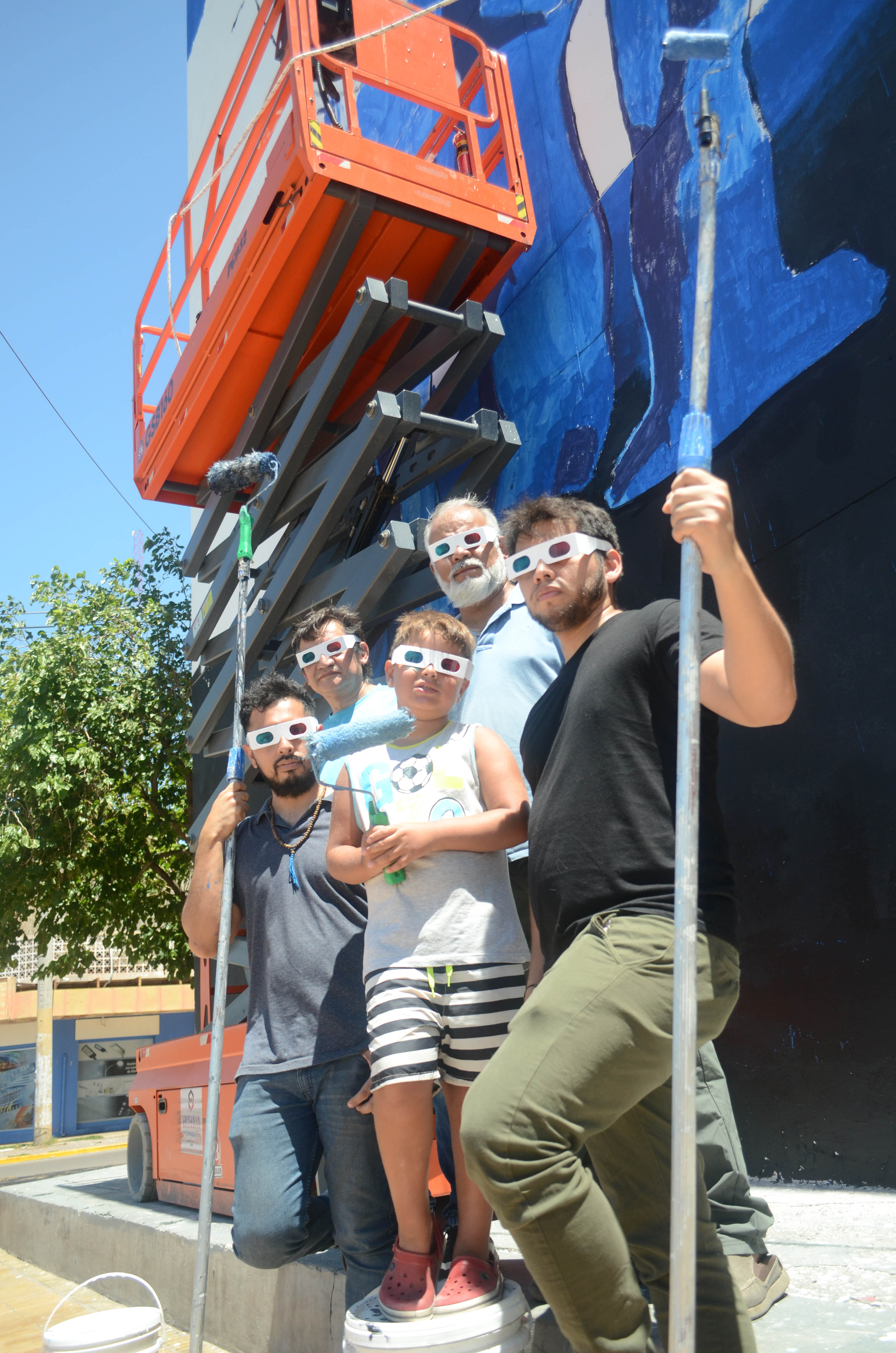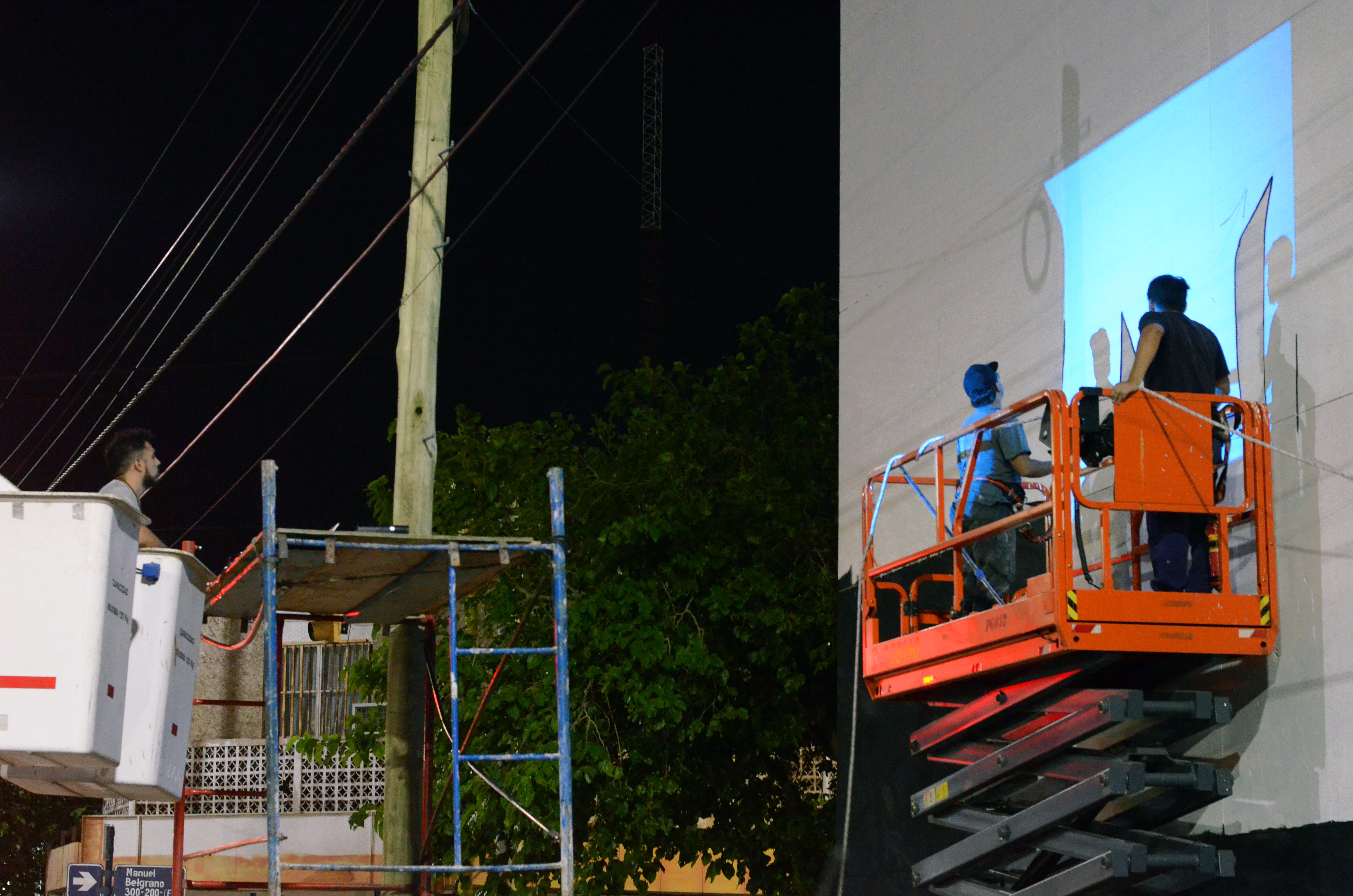 La semana pasada comenzaron a blanquear la pared, a proyectar la silueta que querían plasmar y luego a pintar sin descanso. No fue sencillo, ya que tuvieron que subirse a una grúa hidráulica para lograr el objetivo ya que la pared este de la escuela mide más de 16 metros de alto y unos 12 metros de ancho. En esta obra están involucrados Lucas Aguirre, dibujante, fotógrafo y como inquieto curioso de las nuevas tecnologías inmersivas, el "papá" de la criatura y por ende el coordinador y productor del proyecto, pero a su participó un grupo de artistas plásticos que se ocuparon técnicamente y le dieron color a cada detalle, entre quienes se puede nombrar a Maximiliano Heredia (que es quien además se ocupó de la proyección o mapeado sobre el muro), los experimentados en pintura hiperrealista Matías Alcaraz y Leandro Martín Molina y Fabio Pereyra, quien fue la mano derecha del conocido Mario Pérez. A la distancia, desde Buenos AIres, Fernando Maldonado, un experto en conjugar Artes Visuales con tecnología, fue quien hizo sus aporte para desentrañar la técnica de pintura con que se haría y colaboró con la realización del filtro (que está alojado en Instagram) y puede descargarse para tener otra experiencia con la observación del mural.