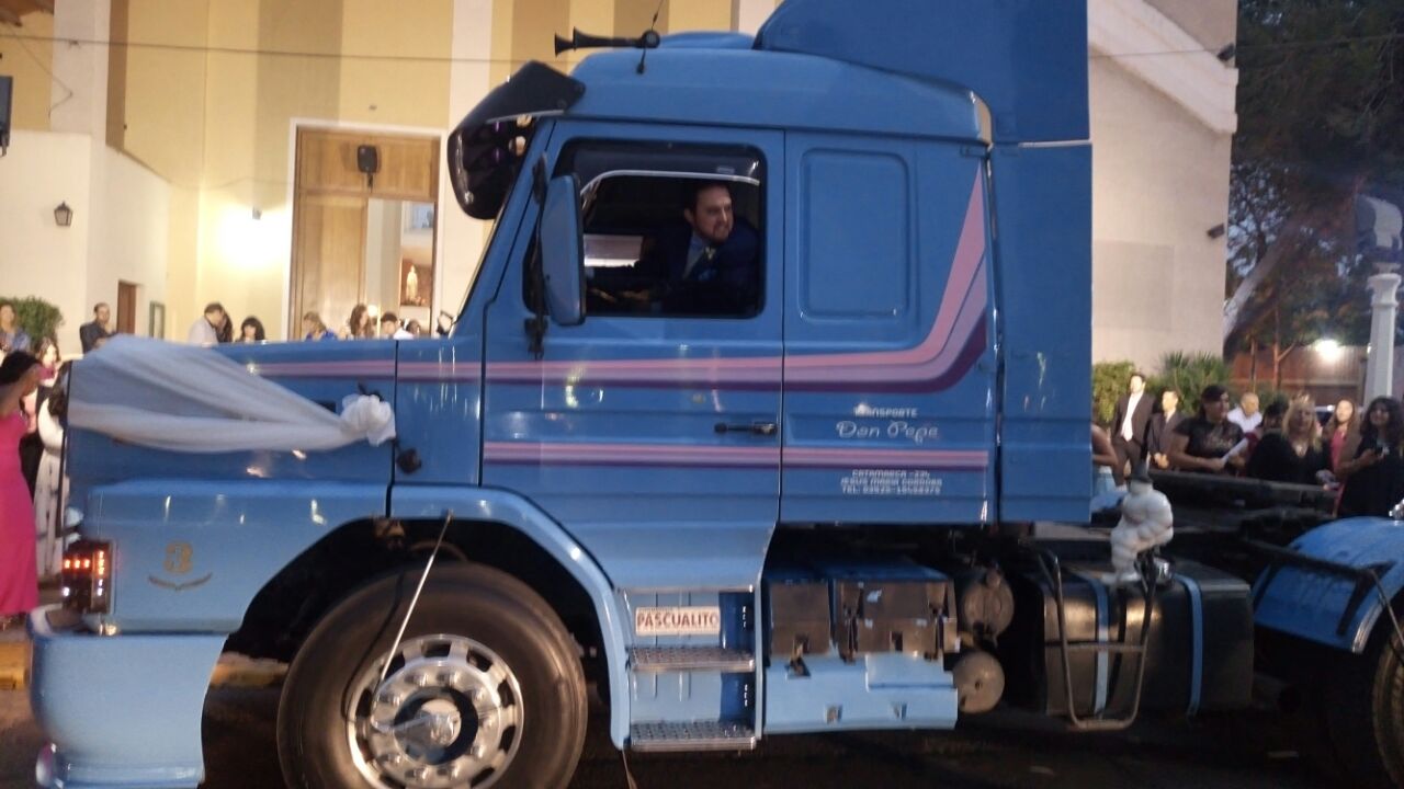 El camión fue adornado con un enorme moño blanco en la trompa y atrás le colocaron una cola y las tradicionales latas. El novio lo condujo tras salir de la Iglesia.