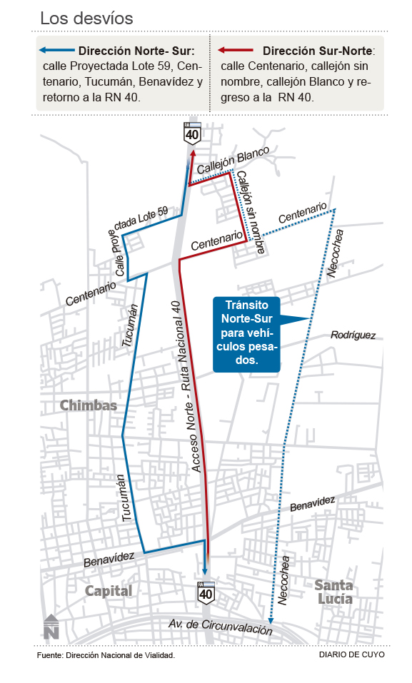 Desde hoy, quienes transiten de Norte a Sur por ruta 40 deberán desviarse hacia el Lote 59 antes de llegar a Centenario (ver infografía). Luego, tendrán que acceder a calle Tucumán y desde ahí hasta Benavídez, para recién entonces retomar la ruta. Esta desviación representa un recorrido de 5,5 kilómetros, lo que implica 1,7 kilómetros más con respecto al tramo lineal de la 40. Se trata entonces de un extra de 45% pues de lo contrario, desde el inicio del desvío hasta el cruce con la Benavídez, la traza recta de la ruta es de 3,8 kilómetros.
