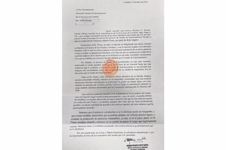 Quien suscribe esta misiva, Ricardo O. Seirutti Garcia, Obispo Auxiliar de la Arquidiócesis de la Provincia de Córdoba, hago llegar a Ud. y por su digno intermedio al resto de los Sres. Miembros del Jurado que Ud. preside. nuestra honda preocupación acerca del proceso de Jurado de Enjuiciamiento llevado a cabo en contra del Dr. Francisco Martín Flores, por parte de dicho órgano.