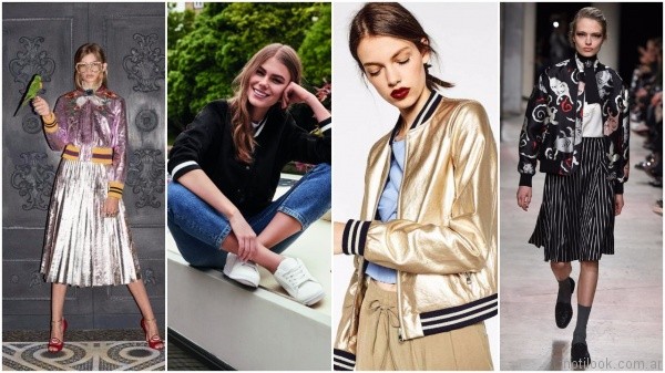 Campera Bomber: La campera bomber de seda y en colores brillantes, una reinterpretación de las camperas de seda japonesas, con bordados de dragones y serpientes que, combinadas con faldas vaporosas y zapatos femeninos, se ve como el nuevo uniforme de las geishas urbanas. También esta la versión, más deportivas y casual, confirmando que el concepto sporty chic que se instaló hace varias temporadas.