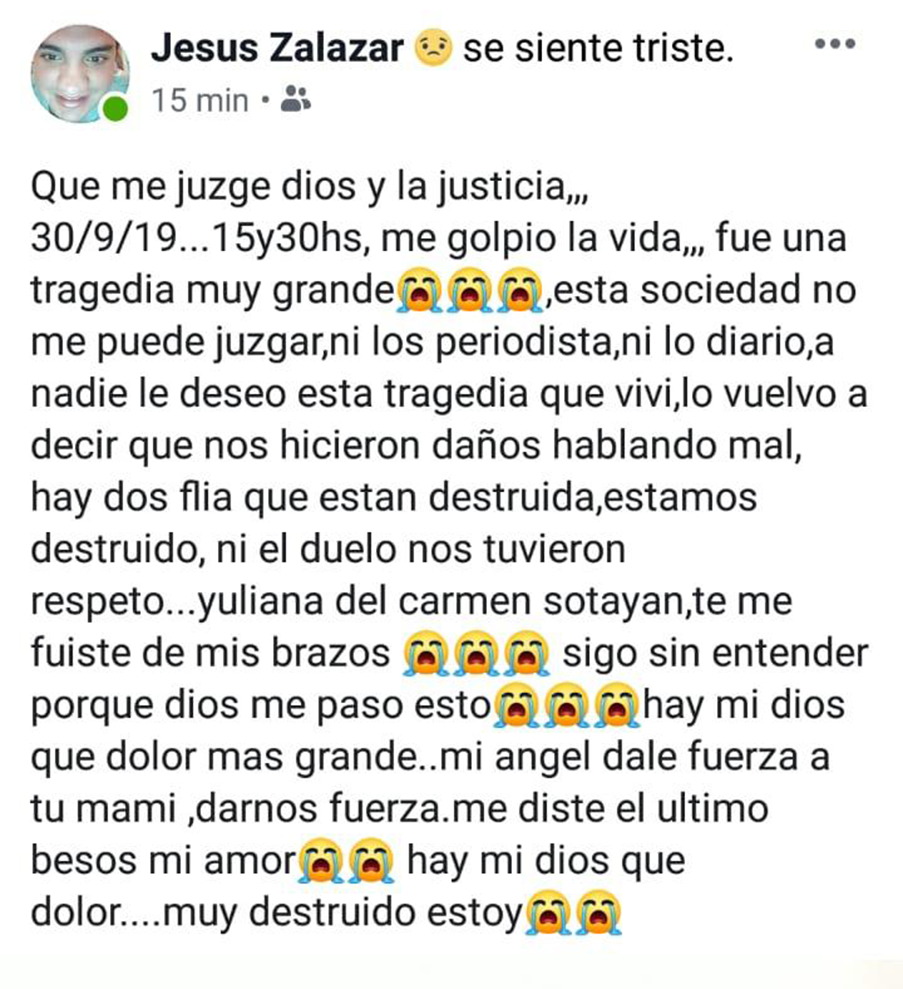 El viernes pasado Zalazar recuperó la libertad en la causa caratulada como homicidio culposo y se encuentra, según escribió en Facebook, totalmente destruido por el fallecimiento de la pequeña Yuliana del Carmen Sotayan, de tan solo 6 meses.