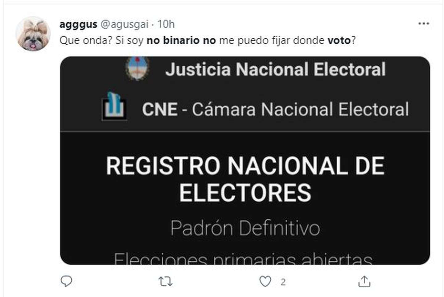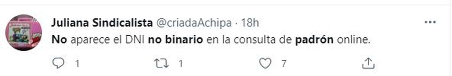 “¿Si soy no binario no me puedo fijar dónde voto?”, se preguntó una usuaria de Twitter. “No aparece el DNI no binario en la consulta del padrón online”, se quejó otra persona.