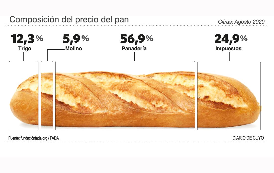 *El pan francés en agosto tuvo un precio de $107,50 por kilogramo (precio a nivel nacional), de ese precio el trigo representa el 12,3% del precio final ($13,27), el molino el 5,9% ($6,27), la panadería el 56,9% ($61,20) y los impuestos el 24,9% ($26,80).