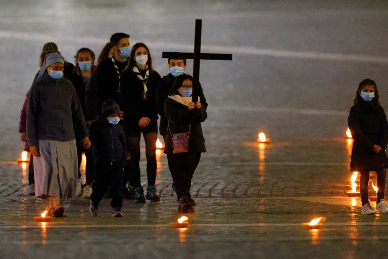 El papa Francisco encabezó la procesión del Vía Crucis en la plaza de San Pedro -al igual que el año pasado por la pandemia de coronavirus- y no en el Coliseo, como se realizaba ininterrumpidamente desde 1964.
