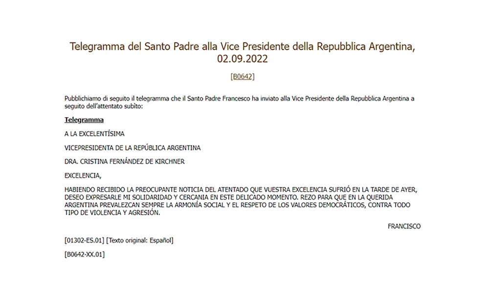 Con el encabezado “a la excelentísima vicepresidenta de la República Argentina, Cristina Fernández de Kirchner”, el máximo representante de la Iglesia Católica le envió también un telegrama oficial a la Vicepresidenta con el siguiente mensaje: “Habiendo recibido la preocupante noticia del atentado que vuestra excelencia sufrió en la tarde de ayer, deseo expresarle mi solidaridad y cercanía en este delicado momento”.