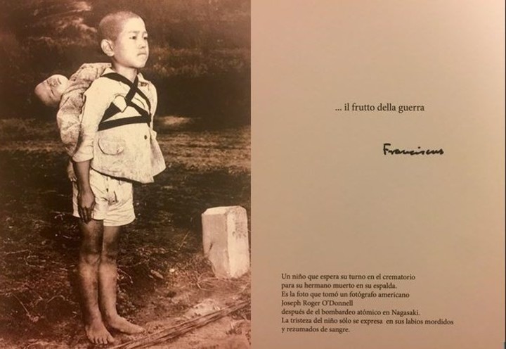 “La he encontrado por caso, es el 45 y es un niño con su hermanito muerto en la espalda esperando el turno ante el crematorio en Nagasaki después de la bomba. Me conmovió cuando la vi y solo quise escribir: el fruto de la guerra y pensé en imprimirla”, dijo. “Porque conmueve más que mil palabras”, agregó.