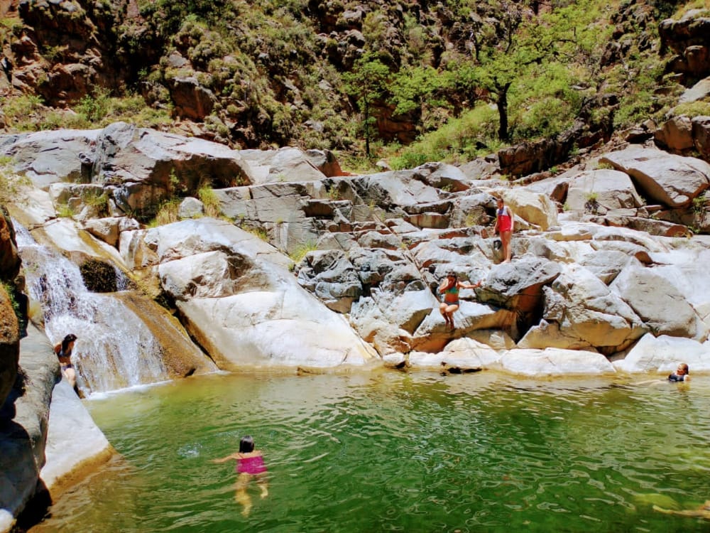 Nobleza obliga decirlo, la caminata es larga y no es para cualquiera. Si bien no es requisito ser un experto en ni estar entrenado, la experiencia implica una mínima destreza para poder sortear cauces de agua, rocas y el paso sostenido por una huella que no siempre está visible. De todos modos, el trayecto se hace ameno porque se va oliendo plantas y aprendiendo de sus propiedades curativas o encontrando variedades que sirven para calmar penas y dolores y se va observando especies animales que sorprenden en el camino. Lo mejor de todo es el final de cada tramo, cuando emerge de la roca esa bocanada de agua, que refresca, sin lugar a dudas el ambiente y que termina en un espejo de agua en el que se puede bañar sin problemas. Prometen que el agua no es tan fría. Y se disfruta muchísimo.