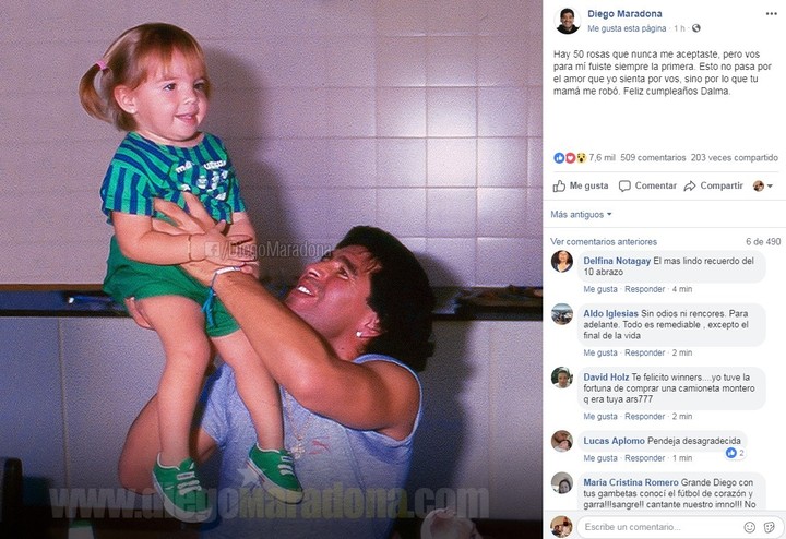 "Hay 50 rosas que nunca me aceptaste, pero vos para mí fuiste siempre la primera. Esto no pasa por el amor que yo sienta por vos, sino por lo que tu mamá me robó. Feliz cumpleaños Dalma", escribió Diego, y acompañó el posteo con una foto de él levantando a Dalma cuando era una niña.