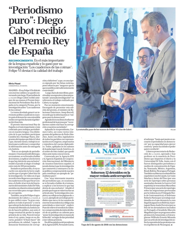 El rey Felipe VI lo felicitó con enorme calidez y se quedó conversando rato largo. El periodista de la nación Diego Cabot recibió anteayer de sus manos el Premio Internacional de Periodismo Rey de España en la categoría Prensa, por la investigación sobre “Los cuadernos de las coimas”.