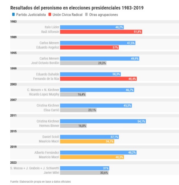 Los resultados de anoche obtenidos por las tres fórmulas peronistas en estas PASO reflejan la peor performance de ese espacio desde el retorno de la democracia. Los 31 puntos que sacaron Sergio Massa, Juan Grabois y Juan Schiaretti sumados – las dos listas que compitieron en la interna del oficialismo, y la del mandatario cordobés por el peronismo disidente- están muy por debajo del piso histórico del Partido Justicialista. Massa quedó relegado al segundo lugar como el candidato más votado con el 21,19% de los sufragios, detrás de Javier Milei, de La Libertad Avanza, que obtuvo 30,73%.