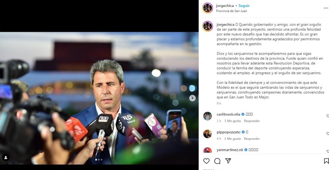 El secretario de Deportes, Jorge Chica, realizó un extenso posteo. "Dios y los sanjuaninos te acompañaremos para que sigas conduciendo los destinos de la provincia", escribió.