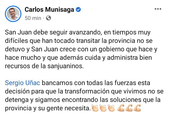 Ni bien Sergio Uñac confirmó que será candidato a un tercer mandato como gobernador, la mayoría de los funcionarios, referentes del PJ y agrupaciones sociales se volcaron a las redes sociales para manifestar su apoyo.