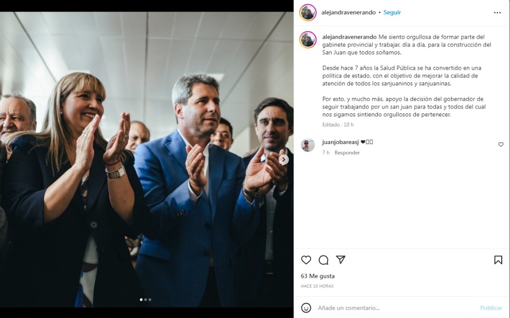 La ministra de Turismo, Claudia Grynszpan, también utilizó las redes sociales para dejar plasmado su apoyo. "Valoramos y defendemos el trabajo que a diario realiza por cada sanjuanino y sanjuanina", publicó.