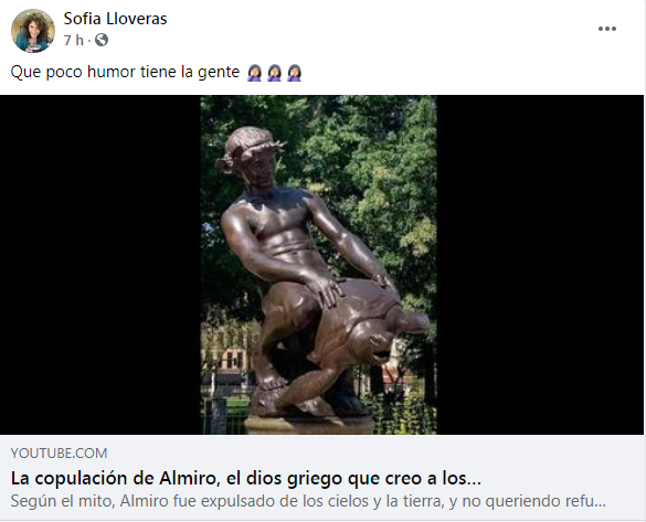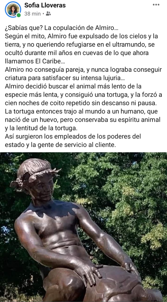 En su cuenta de Facebook, Lloveras se refirió al texto "La copulación de Almiro", lo acompañó con la foto de una obra sobre la fábula, la relató y aseguró: "La tortuga entonces trajo al mundo a un humano, que nació de un huevo, pero conservaba su espíritu animal y la lentitud de la tortuga. Así surgieron los empleados de los poderes del Estado y la gente de servicio al cliente".