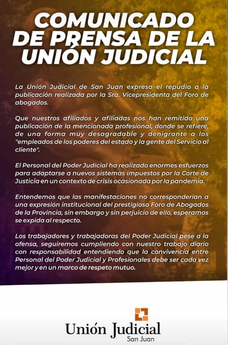 Horas después, la Unión Judicial de San Juan difundió un comunicado en "repudio a la publicación realizada por la Sra. Vicepresidenta del Foro de Abogados". Y detalló: "Que nuestros afiliados y afiliadas nos han remitido una publicación de la mencionada profesional, donde se refiere, de una forma muy desagradable y denigrante a los ‘empleados de los poderes del estado y la gente del Servicio al cliente’. El Personal del Poder Judicial ha realizado enormes esfuerzos para adaptarse a nuevos sistemas impuestos por la Corte de Justicia en un contexto de crisis ocasionada por la pandemia. Entendemos que las manifestaciones no corresponderían a una expresión institucional del prestigioso Foro de Abogados de la Provincia, sin embargo y sin perjuicio de ello, esperamos se expida al respecto".