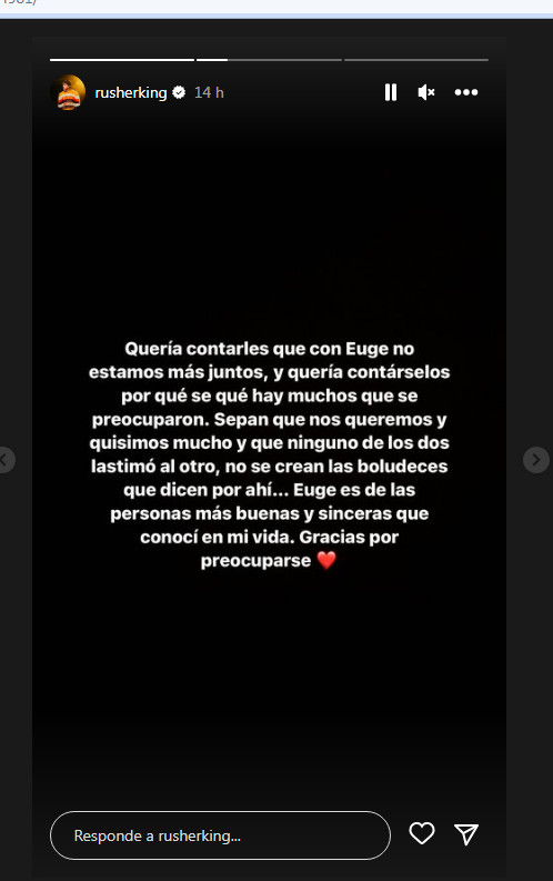 Y siguió: “Sepan que nos queremos y quisimos mucho y que ninguno de los dos lastimó al otro, no se crean las boludeces que dicen por ahí… Euge es de las personas más buenas y sinceras que conocí en mi vida. Gracias por preocuparse”.