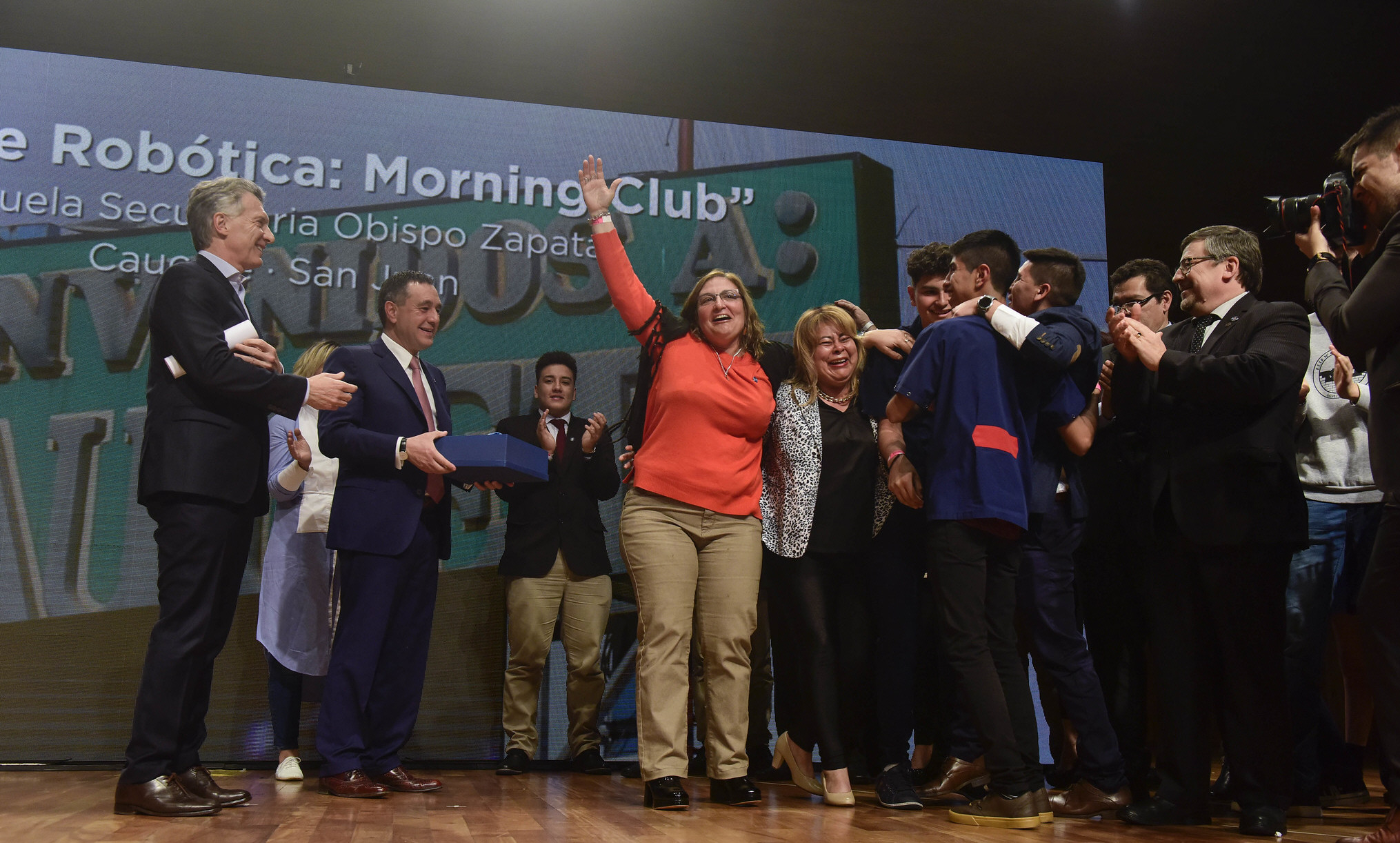Luego del reconocimiento que alcanzó el año pasado por 3 alumnos que ganaron un maratón de programación, la escuela caucetera Obispo Zapata, ubicada en Pozo de Algarrobos, lejos de dormirse en esos laureles siguió alimentando su club de robótica, "Morning Club", y ayer su comunidad vivió otra alegría mayúscula al ganar el primer premio del concurso "Maestros Argentinos 2019", que organiza el Ministerio de Educación de la Nación y que entregó personalmente el presidente Mauricio Macri, en el acto que se desarrolló en el Centro Cultural Kirchner.