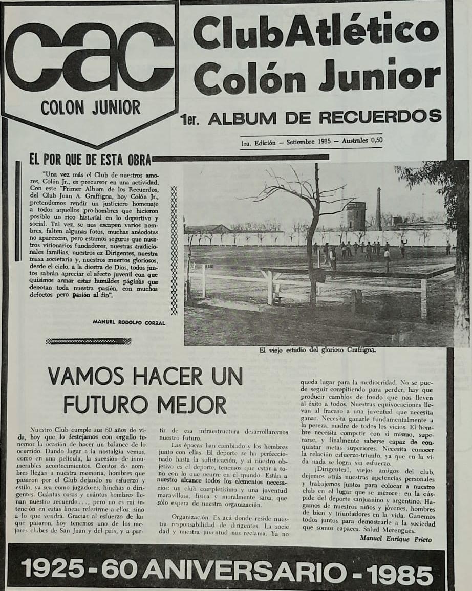 Año 1985, se enfrentan en una de las primeras fechas del "Torneo Iniciación" del Fútbol Sanjuanino Atlético de la Juventud Alianza y el local Colón Junior. Lindo clima previo. Se observa una escaramuza en la entrada de la platea. Un joven dirigente del club dueño de casa ve cómo al ídolo de su niñez, el goleador de los años sesenta y setenta Hugo Riveros, se le restringe la entrada por problemas administrativos. El directivo se prometió a sí mismo trabajar en un documento histórico para que las nuevas generaciones conozcan e identifiquen a quienes han sido protagonistas de la vida de la Institución. Así nace el Primer Álbum de Recuerdos del Club Colón Junior (foto). Con un tiraje de 3.500 ejemplares y una segunda impresión de 500 más en formato tabloide con 16 páginas, en sistema offset (que había llegado a Cuyo de la mano de Don Francisco Montes en el Diario Mendoza, allá por 1970), y editado en los talleres gráficos de "El Viñatero". Salió a la venta al precio de 0,50 australes, la moneda de entonces.