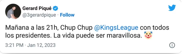 “Mañana a las 21 horas, Chup Chup de la Kings League con todos los presidentes. La vida puede ser maravillosa”, escribió el ex jugador del FC Barcelona en su cuenta oficial de Twitter, donde hizo un anuncio vinculado a su nuevo proyecto pero lo cerró con una frase contundente.