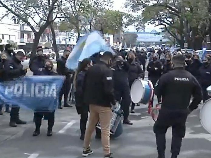 En estos momentos, los policías estacionaron los vehículos a 45 grados sobre la avenida Maipú. Con sus uniformes y banderas de Argentina, los efectivos reclaman que se cumplan sus demandas para destrabar el conflicto que ya lleva tres días y se extiende por el interior de la provincia de Buenos Aires.