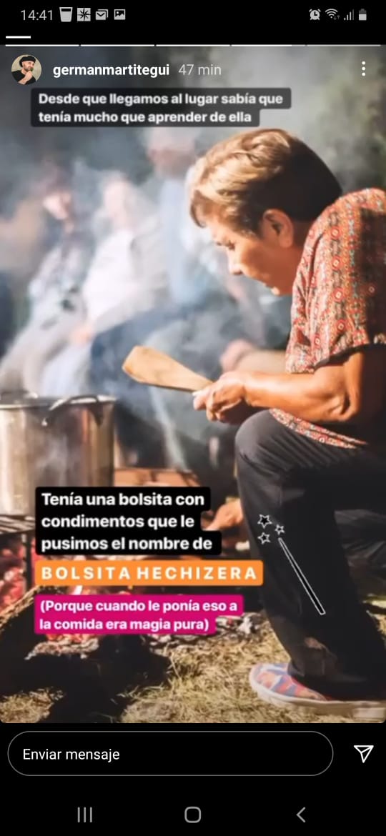 "La conocí recorriendo San Juan. Desde que llegamos al lugar sabía que tenía mucho que aprender de ella. Tenía una bolsita con condimentos que le pusimos el nombre de BOLSITA HECHIZERA (porque cuando le ponía eso a la comida era magia pura). Y después vino a Buenos Aires a visitarme", expresó.