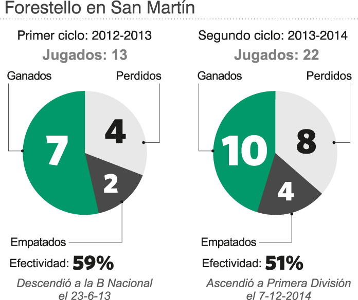 En apenas 22 jornadas consiguió el ansiado retorno al máximo nivel de Argentina ganándole a Ferro en la última fecha en San Juan. Luego, se alejó pero para la dirigencia y los hinchas del Verdinegro, fue simplemente un hasta luego. Forestello llegará acompañado por Marcelo Franchini como ayudante de campo y por Diego Burkhard como preparador físico. El momento es complejo y no hay tiempo para mucho.