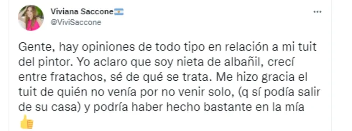”Gente, hay opiniones de todo tipo en relación a mi tuit del pintor. Yo aclaro que soy nieta de albañil, crecí entre fratachos, sé de qué se trata. Me hizo gracia el tuit de quién no venía por no venir solo, (q sí podía salir de su casa) y podría haber hecho bastante en la mía”, tuvo que salir a aclarar Saccone.