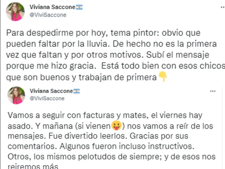 Más tarde Saccone cerró dio por concluido el tema. “Para despedirme por hoy, tema pintor: obvio que pueden faltar por la lluvia. De hecho no es la primera vez que faltan y por otros motivos. Subí el mensaje porque me hizo gracia. Está todo bien con esos chicos que son buenos y trabajan de primera”. Y agregó: “Vamos a seguir con facturas y mates, el viernes hay asado. Y mañana (si vienen) nos vamos a reír de los mensajes. Fue divertido leerlos. Gracias por sus comentarios. Algunos fueron incluso instructivos. Otros, los mismos pelotudos de siempre; y de esos nos reiremos más”.