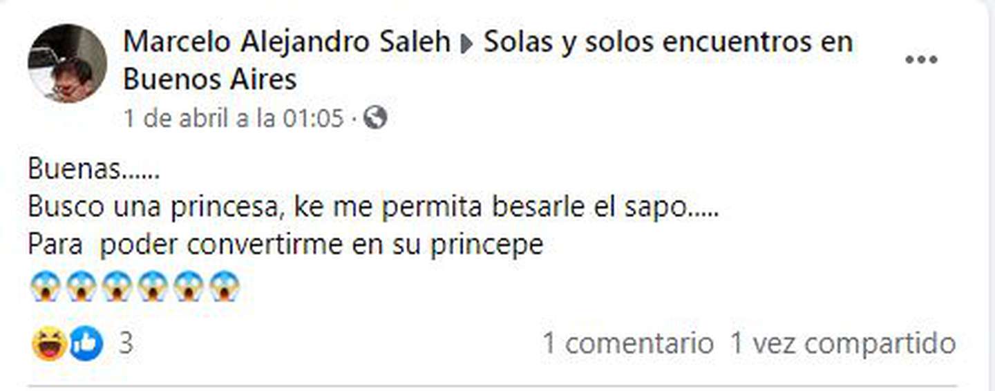 En estos últimos tres años que pasó en libertad, lo ajeno siguió siendo una gran debilidad para Saleh. Pero también se dedicó a buscar a través de las redes sociales una compañía femenina. “Busco una princesa, que me permita besarle el sapo…para poder convertirme en su príncipe”, fue la “romántica” propuesta que publicó en el grupo de Facebook “Solas y solos encuentros en Buenos Aires” el 1 de abril a la madrugada. Unos días después, la tentación de la plata fácil volvió a dejarlo preso.