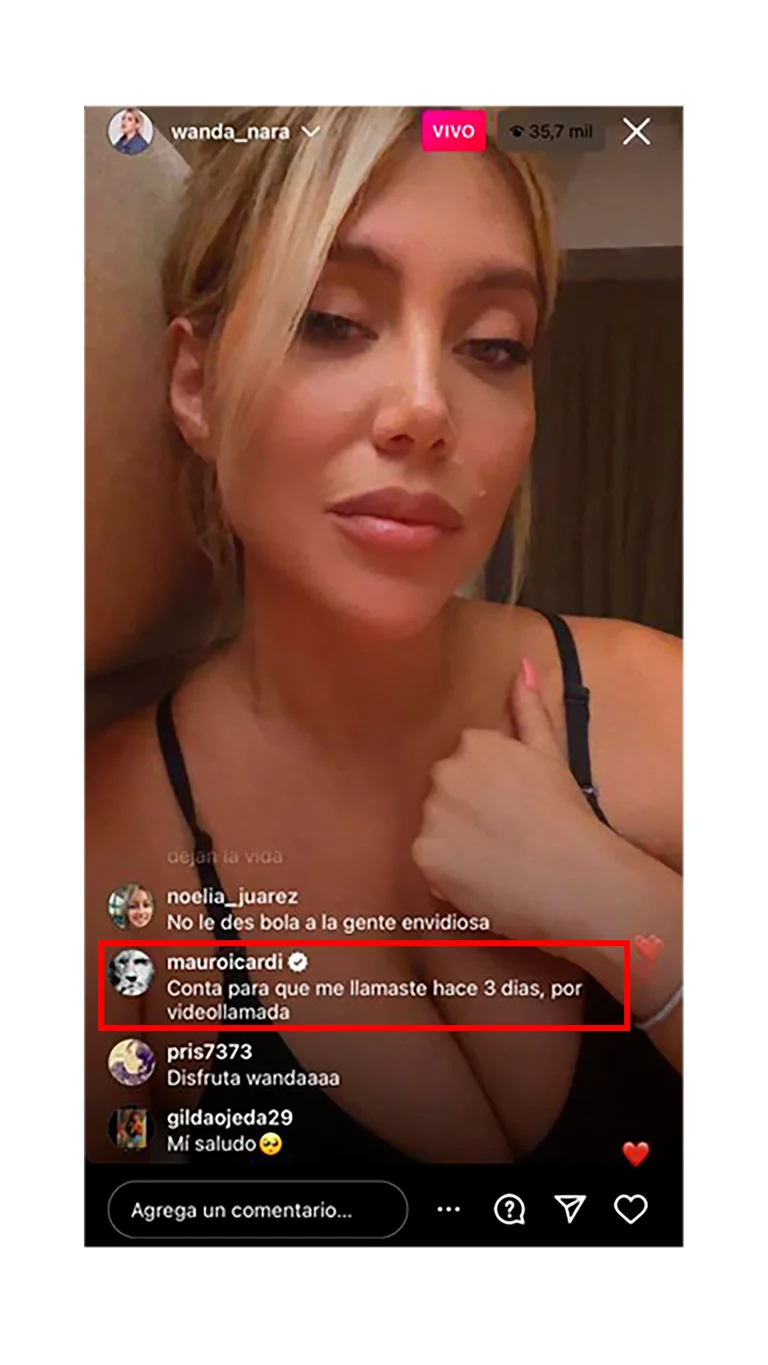 Atento a sus palabras y en una total intromisión, Mauro Icardi seguía al detalle cada cosa que decía su ex y comenzó a dejar picantes comentarios. “No te hagas la boluda”, le escribió cuando ella contaba que estaba soltera. Y como si se tratase de un seguidor más, mientras la gente lo arengaba para que deje más mensajes en ese tono, siguió: “Muy ex, pero me volvés loco a videollamadas”.