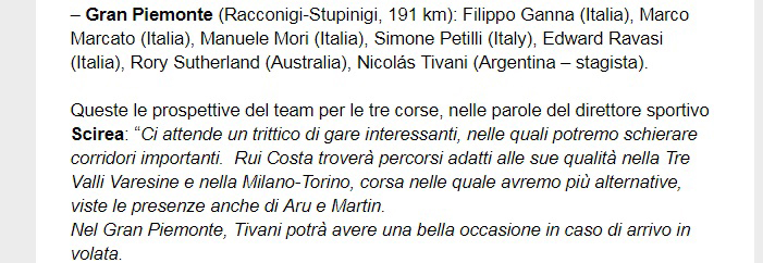 Ser o no ser. Esta simple y eterna disyuntiva que se presenta en la vida de los seres humanos afrontará mañana el ciclista sanjuanino Nicolás Tivani. El pedalista que el 30 de este mes cumplirá los 23 años está viviendo uno de los momentos más importantes de su corta y exitosa campaña deportiva. Incorporado hace poco más de un mes como "stagieri" (aprendiz) en el equipo UWT (UCI World Tour) UAE Emirates, donde disputó tres competencias, "Nico", "El Ardilla", "Niño …" afrontará en la Gran Piamonte, carrera catalogada 1.1 HC (prueba de una etapa, histórica clásica) un gran desafío, del que depende, en gran parte, su futuro profesional.