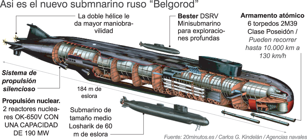 La OTAN (Organización del Tratado del Atlántico Norte) alertó a sus países miembros por la movilización del submarino ruso "K-329 Belgorod", portador del "Arma del Apocalipsis", como se ha dado en llamar al supertorpedo "Poseidón" que es transportado por el submarino, y que es capaz de desplazarse hasta 10.000 kilómetros bajo el agua y luego hacer una explosión cerca de la costa causando un tsunami radiactivo. El Belgorod mide 184 metros de largo y desplaza 30.000 toneladas.