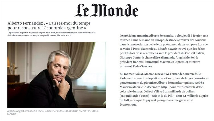 Con el título: “Déjenme reconstruir la economía argentina”, el diario francés publica hoy una entrevista a modo de balance de la gira europea de Alberto Fernández realizada el jueves 6 de febrero, día en que el Presidente argentino emprendía el regreso al país.