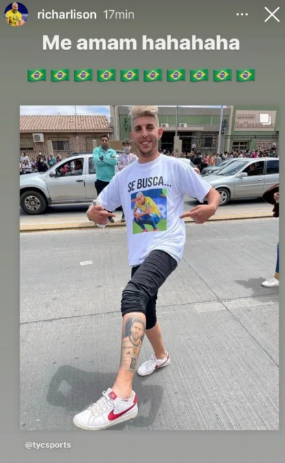 Esa fotografía fue compartida en las redes sociales por TyC Sports y recibió el comentario: "Me aman, jajaja", del propio Richarlison, calentando la previa y tomándose con humor la rivalidad con los fanáticos de la Selección Argentina.