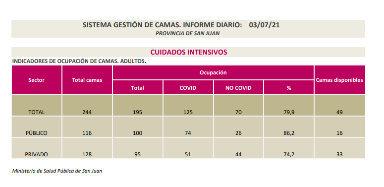 Este sábado, Salud Pública informó que la ocupación de camas en cuidados intensivos es del 79,9% entre el sector público y privado.