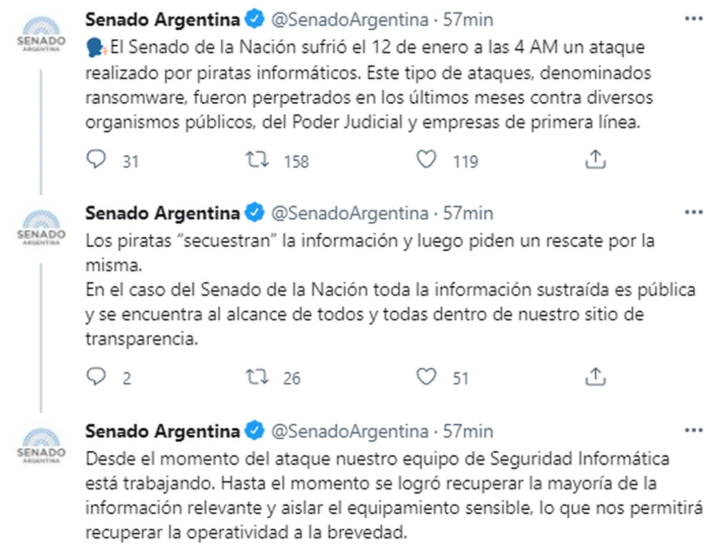 “Este tipo de ataques, denominados ransomware, fueron perpetrados en los últimos meses contra diversos organismos públicos, del Poder Judicial y empresas de primera línea”, comunicó el Senado en su cuenta de Twitter.