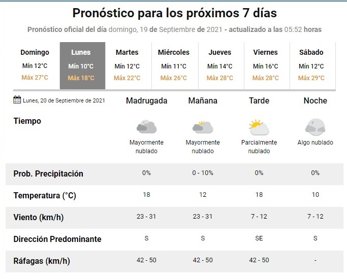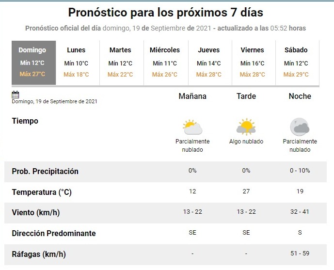 Este domingo la temperatura máxima rondará los 27 grados con cielo algo nublado y viento del sudeste hasta la tarde. Por la noche, el Servicio Meteorológico Nacional anuncia la llegada de viento del sector Sur con ráfagas que podrían alcanzar los 59 kilómetros por hora.