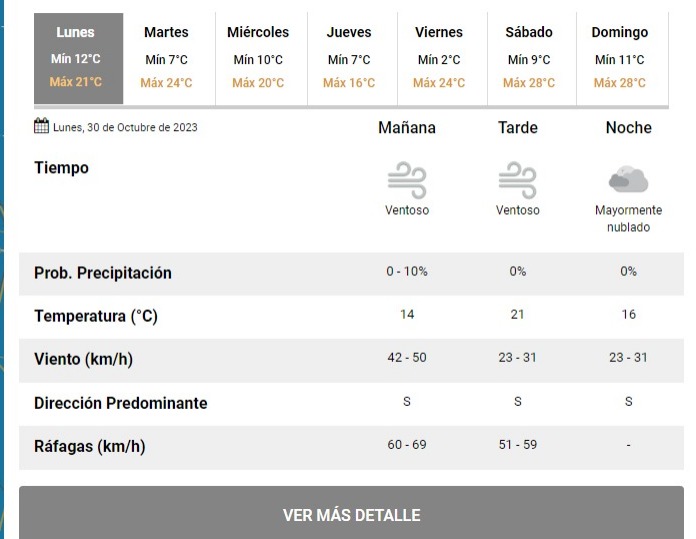 La máxima prevista para hoy es de 21 grados con viento Sur hasta la tarde. En las primeras horas del día se anuncian ráfagas de hasta 69 kilómetros por hora (a las 6 de la mañana llegaron a los 53km/h) con visibilidad reducida por tempestad levantada por el polvo.