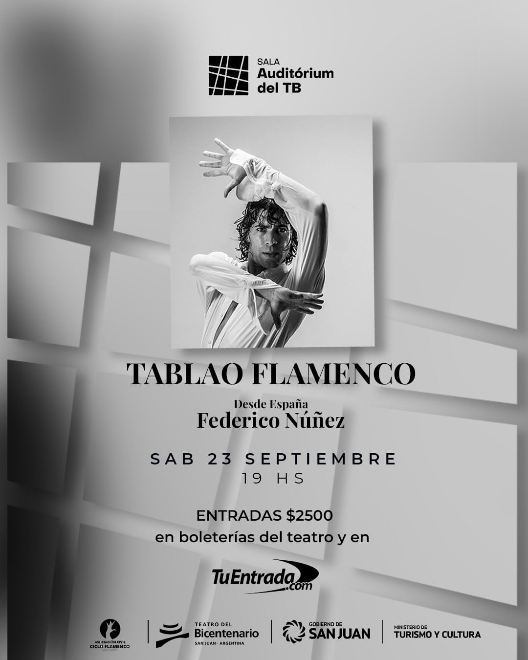 La Sala Auditórium del TB se convierte en un tablao al que subirá el bailaor Federico Nuñez, recién llegado de Sevilla, para brindar un espectáculo imperdible de flamenco andaluz, el próximo 23 de septiembre, a las 19hs, en una nueva función disponible tras agotar entradas.