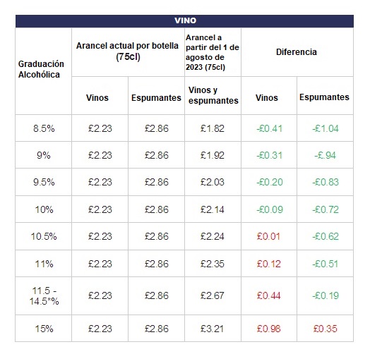 Actualmente el vino y el espumoso que se importa y vende en Reino Unido paga de impuestos a las bebidas alcohólicas por botella un total de 2,23 libras en el caso del vino y de 2,86 libras los espumantes. El nuevo esquema escalonado que regirá desde agosto de 2023 establece primero que ya no habrá diferencia entre tranquilos y espumosos. Sólo habrá una categoría unificada de vinos en general.