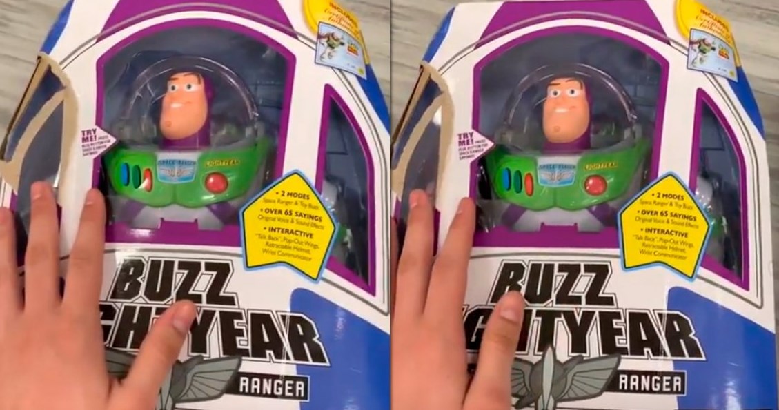 Resulta que, al agarrar la caja de Buzz Lightyear y apoyarla, el muñeco en su interior movió la cabeza, tal como sucede en la película, en la que los juguetes tienen vida a escondidas de sus dueños.