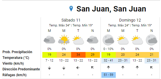 Para el domingo, el viento predominante del sector Sur podría alcanzar ráfagas de hasta 60 kilómetros por hora en la mañana. Continuará soplando todo el día, con velocidad de hasta 32 kilómetros por hora, lo que incidirá en un día mucho menos caluroso, con una mínima de 19 grados y una máxima de 24.