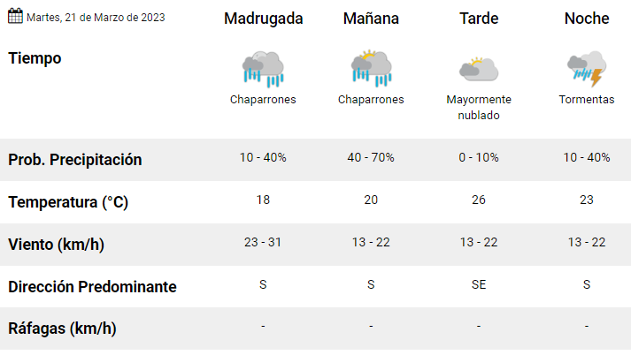 Se espera que los chaparrones aislados se hagan presentes desde las primeras horas del día, con aumento en la probabilidad en la mañana.